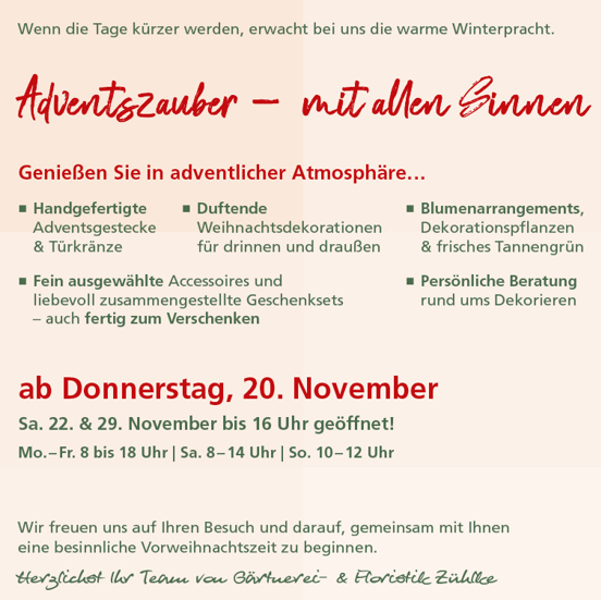 Ob beim Duft von Tannengrün, Kerzenschein oder funkelnden Sternen, wir würden Sie gerne mit all Ihren Sinnen auf die Festtage einstimmen und freuen uns auf Ihren Besuch - Ihr Zühlke-Team.